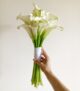 - Bó hoa cầm tay Calla Lily trắng: Phong cách cổ điển, kết hợp với ruy băng satin trắng hoặc vàng ánh kim.